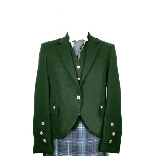 Braemar Jacket With 5 Button Vest, Made In Bottle Green Barathea Fabric With Nickel Buttons.